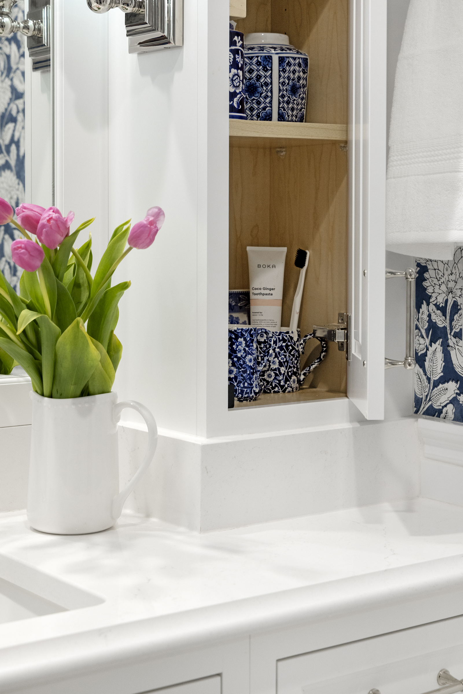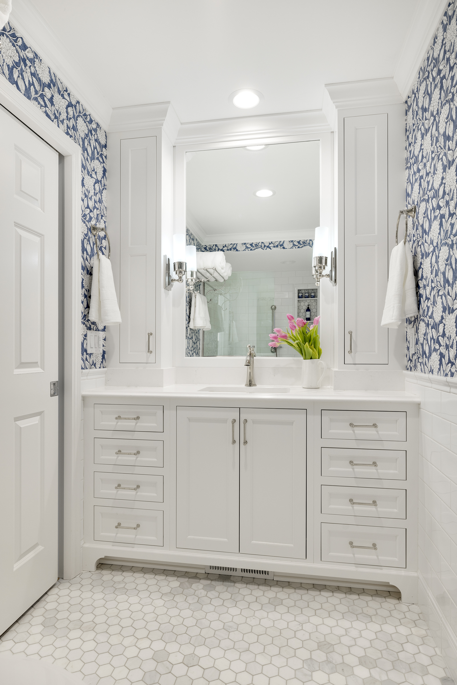 The finishing touch is the statement wallpaper that gives this bathroom its distinctive personality. Delicately outlined Jacobean floral vines in crisp white silhouettes dance across a rich blue background, adding depth, elegance, and a subtle pop of color. The wallpaper brings warmth and charm to the space, softening the marble inspired surfaces and creating a room that feels both refined and inviting.