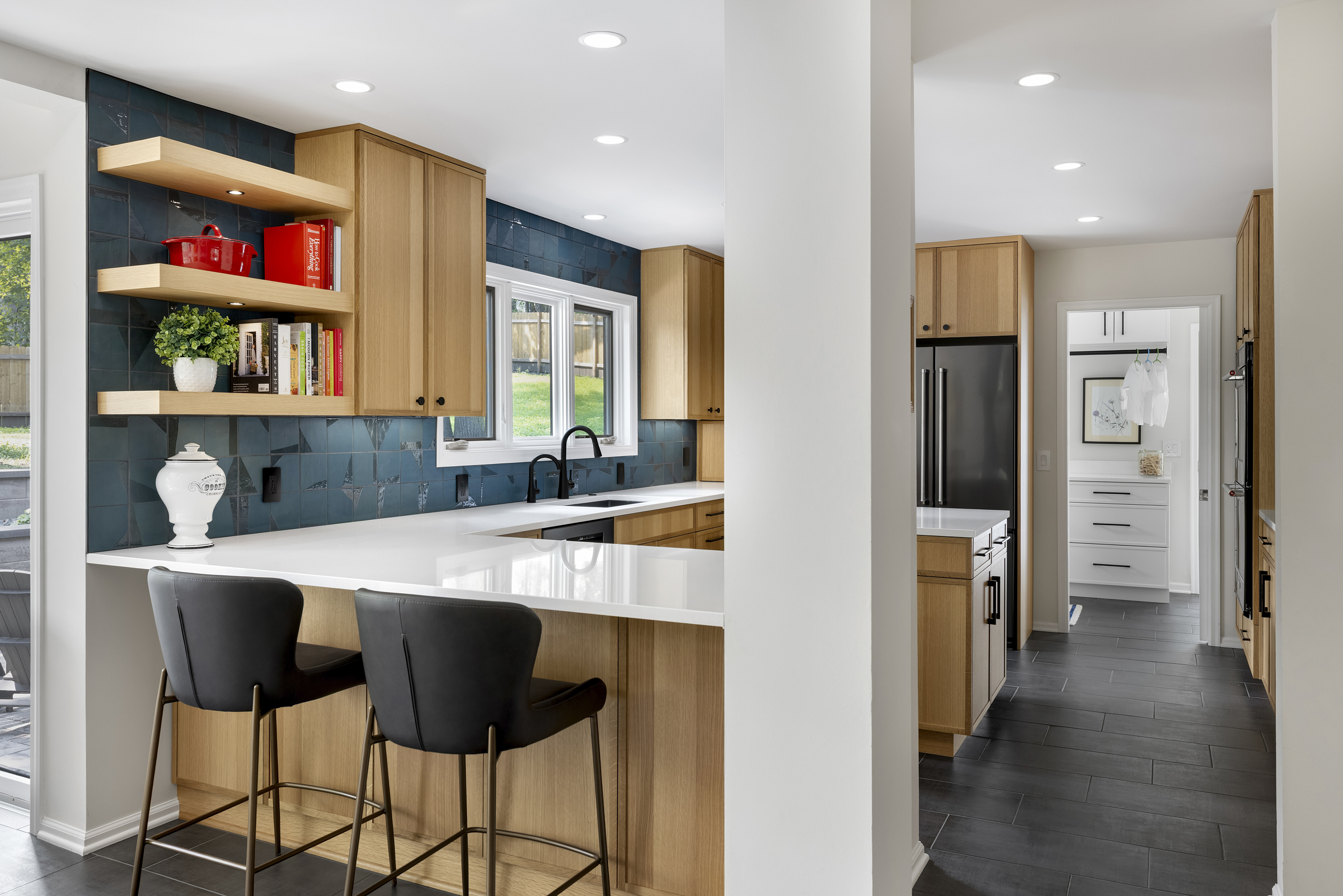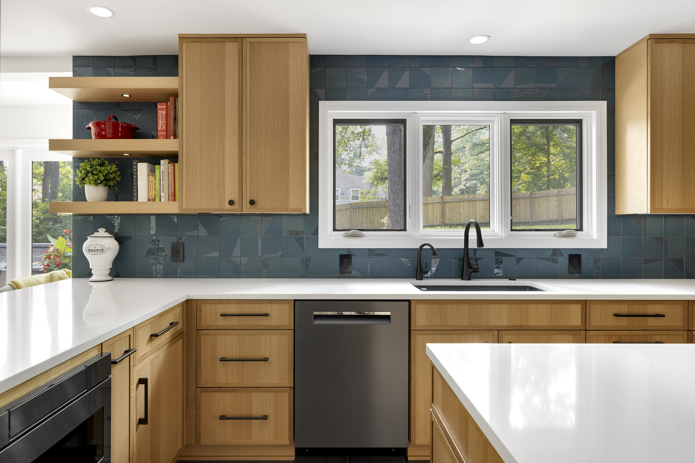 Floating quarter-sawn white oak shelves provide display space for favorite cookbooks and personal touches while tying in beautifully with the natural wood cabinetry.
