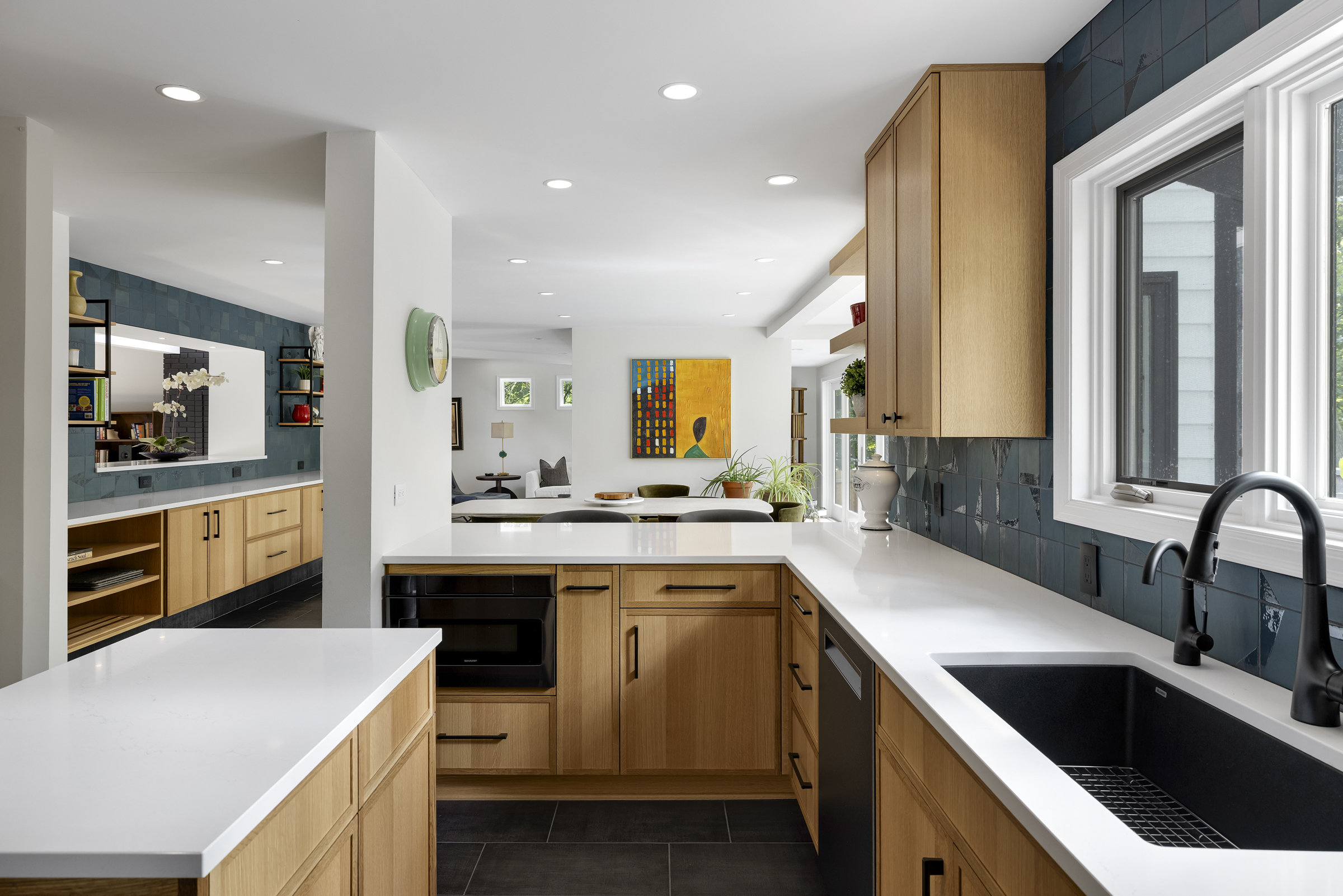 Our homeowners wanted a kitchen that reflected the mid-century style of the home, but with high-quality, easy-to-maintain materials that would last for years to come. They requested real wood cabinetry, functional storage, black accents, and a backsplash tile in a fun color or shape. They also needed better flow and storage; especially since the original layout had no standard-size top drawers and awkwardly placed cabinetry. Their wish list included adding an island to fill the vast open floor space and re-centering the sink with the windows for a more balanced and functional layout.