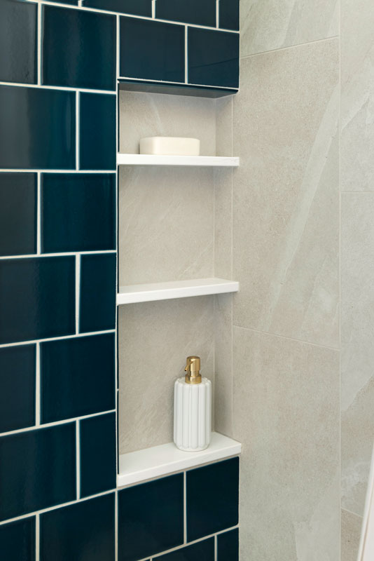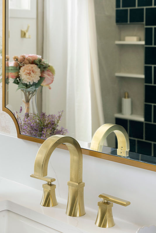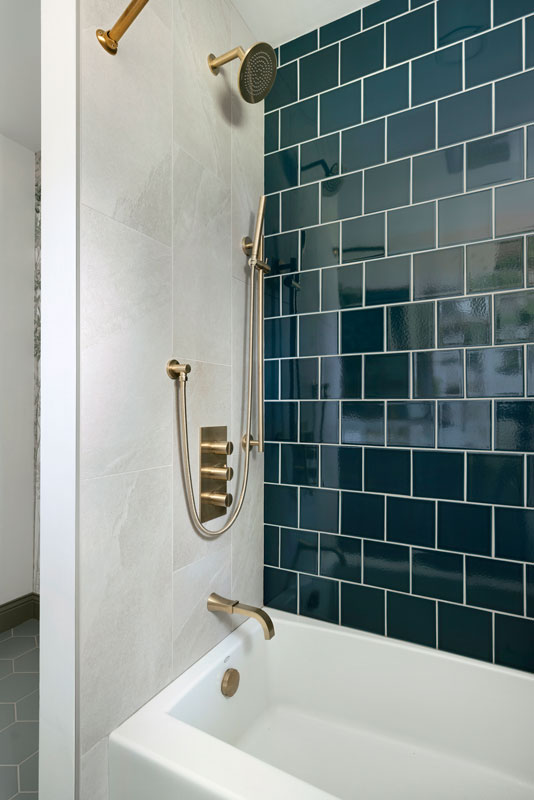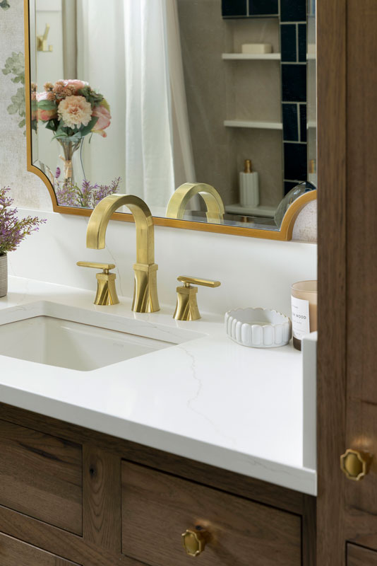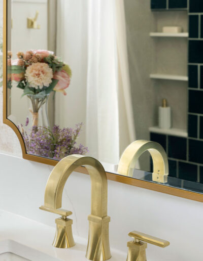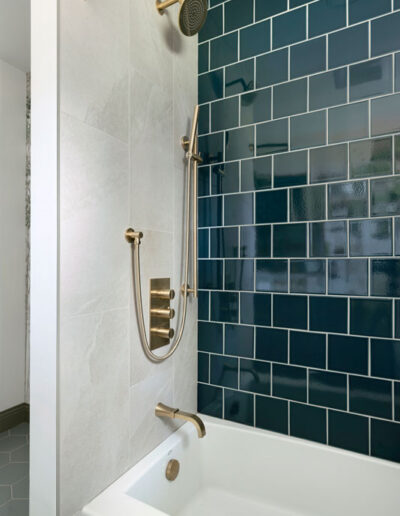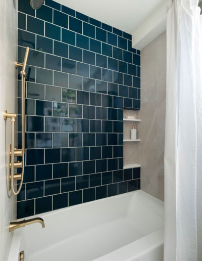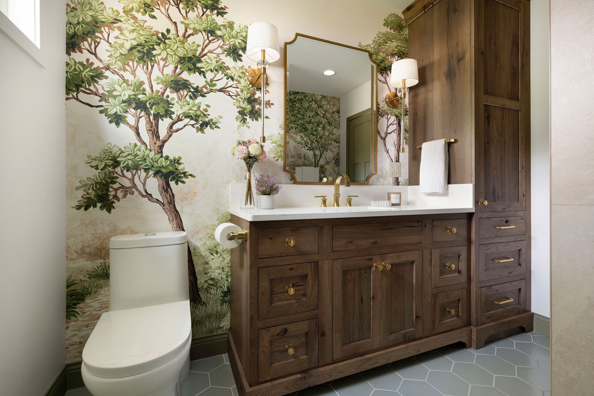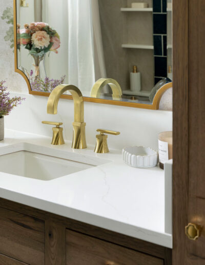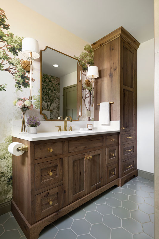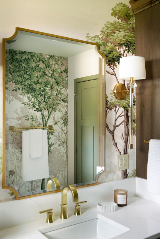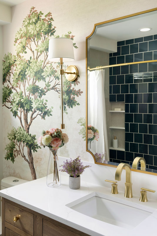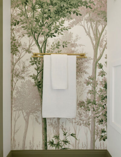 The shower features Fireclay’s handmade 6×6 tile in Caspian Sea, adding depth and richness, while a hand-shower and recessed niche make bathing their grandson easier. Two different, but complimentary murals were custom sized to fit the space and introduce a refined storybook quality. The mural near the door resembles a shaded forest, and the other framing the vanity like a sunlit clearing. Every detail, from the brushed brass fixtures to the alignment of the mural scale with the mirror, was carefully planned to create a sense of immersion and delight.