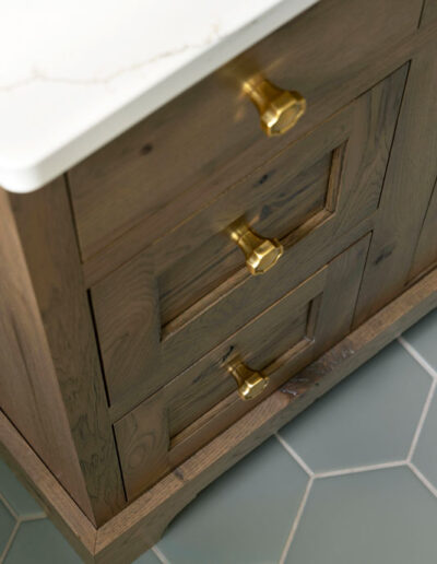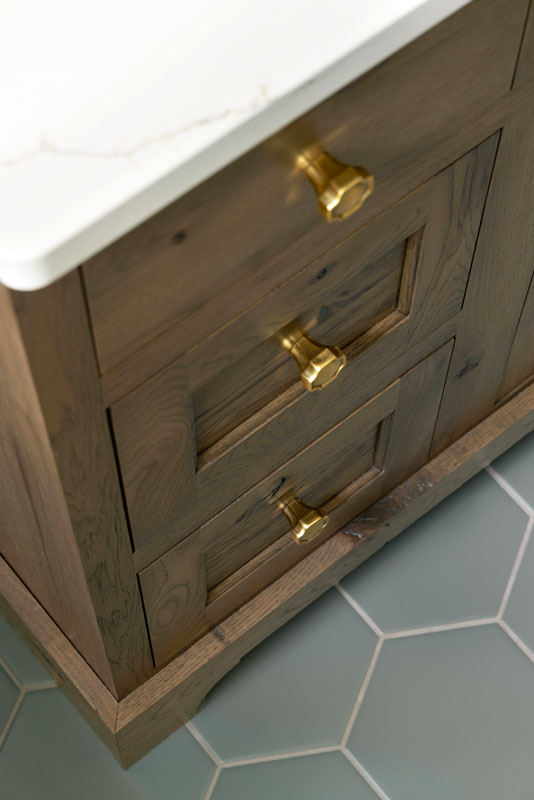 To bring that story to life, the designer removed the soffit to raise the shower ceiling and shortened the shower plumbing wall to make room for a full-depth vanity. A smaller 30″ tub and re-imagined layout preserved circulation while allowing the addition of custom inset cabinetry in rustic alder with a rich Acorn stain. The old linen closet was replaced with a tall storage cabinet featuring roll-out shelves for easy access.