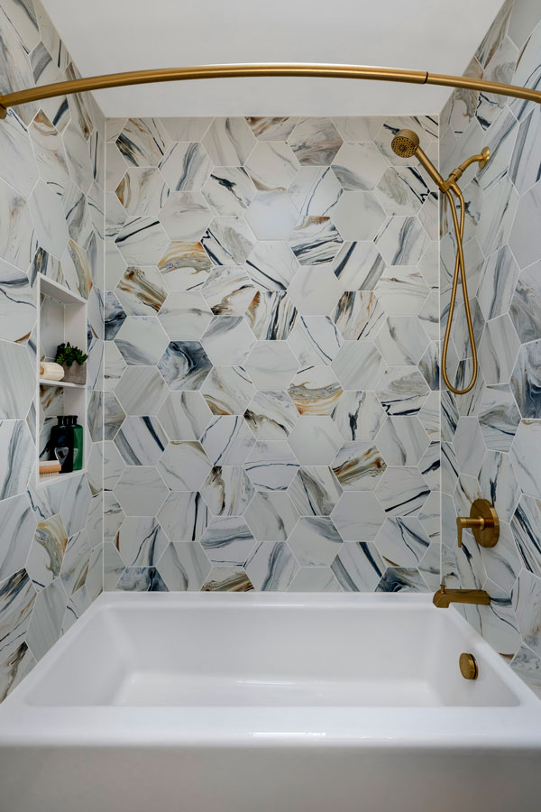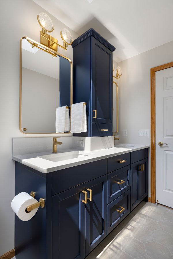 Our design goals were clear: create a more energy-efficient bathroom with spray foam insulation, add a second sink, incorporate more storage, and bring in the homeowner’s love of blue while keeping the space warm and inviting. The reimagined layout features a striking navy double vanity from Crystal Cabinet Works, topped with White Cloud polished quartz, and a tall storage tower between sinks to keep essentials organized. A showstopping Marmaris Sunset hex tile in the shower ties in soft blue veining, while matching brushed brass Kohler fixtures add warmth and consistency throughout.