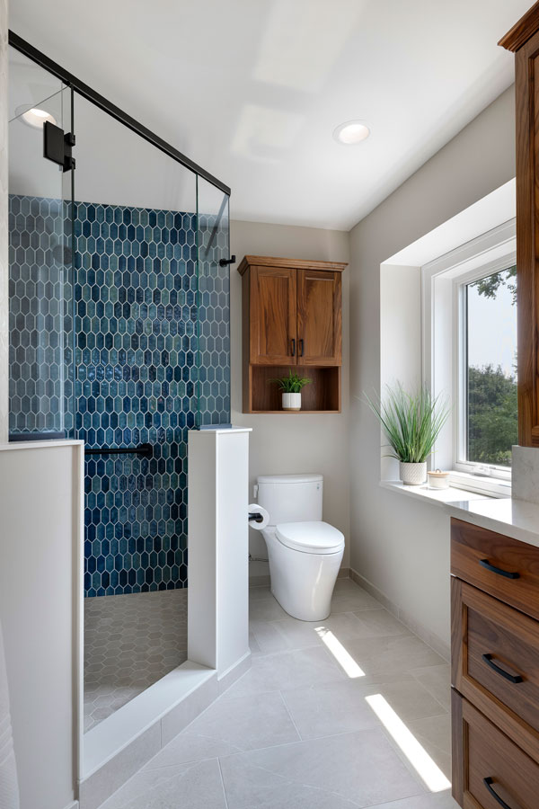The remodel completely reimagined the layout, eliminating the oversized tub and cramped water closet to create a spacious walk-in shower, double-sink vanity, and larger walk-in closet. New spray foam insulation in the walls and in-floor heat keep the space warm and cozy while improving the home’s energy efficiency. The generous new shower features grab bars, a built-in bench, a wall-to-wall shampoo ledge, and a hand shower for comfort and convenience. A striking blue picket tile on the shower’s head wall adds a pop of color that catches the eye the moment you enter the room.