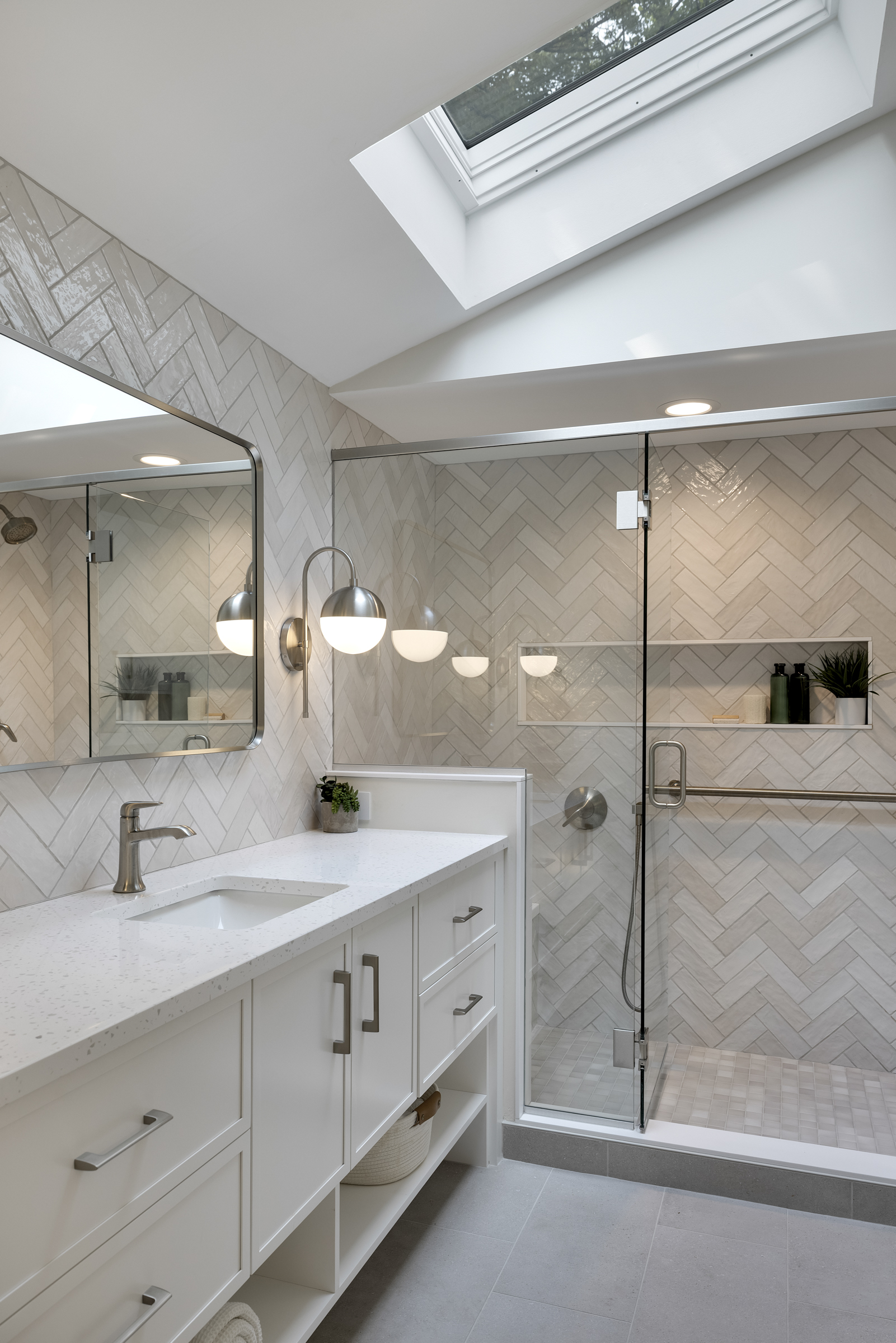 The completed primary bathroom feels bright, calm, and intentionally designed for both present-day living and the future. Natural light from the skylight highlights the layered textures, custom details, and thoughtful accessibility features that make the space as practical as it is beautiful.