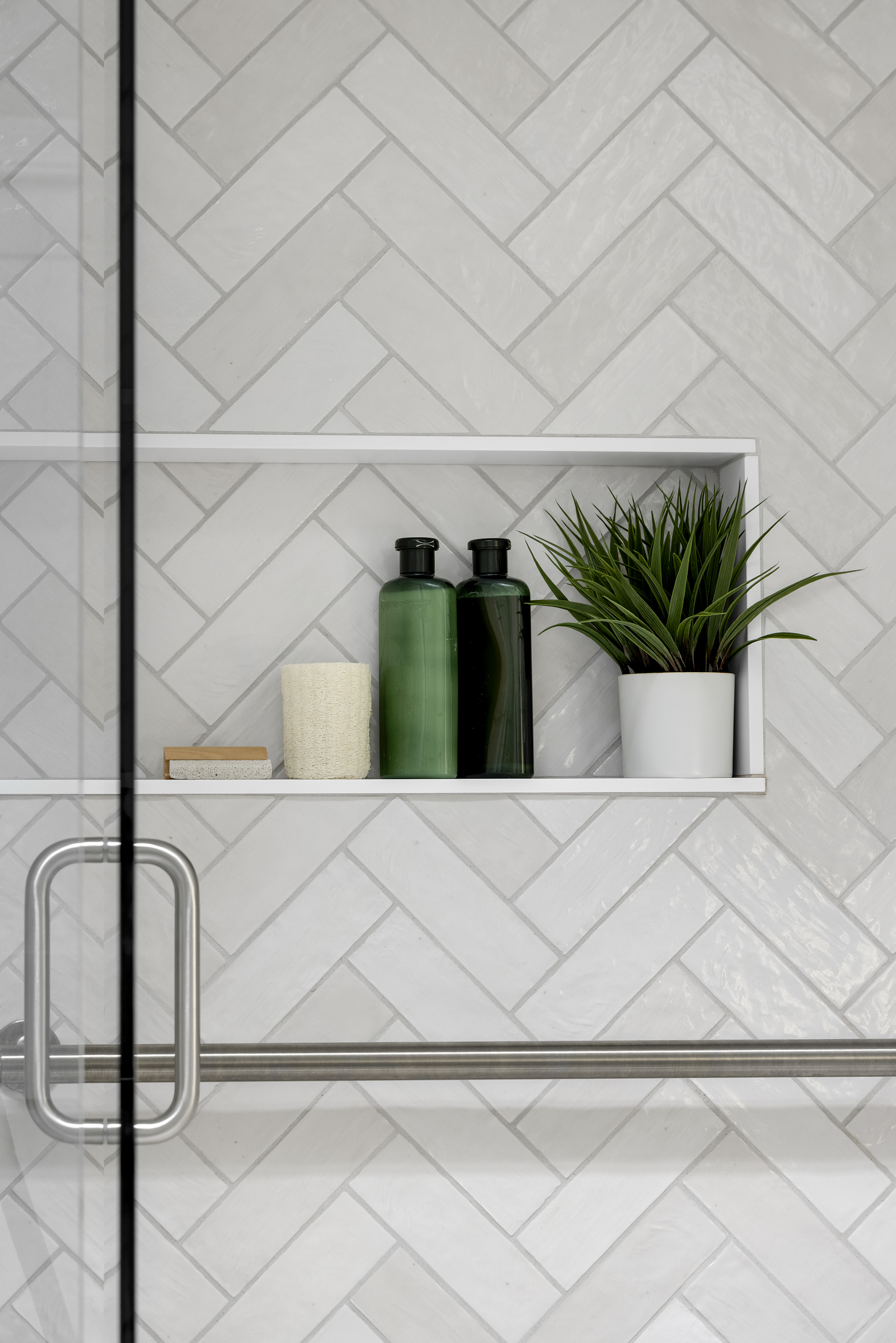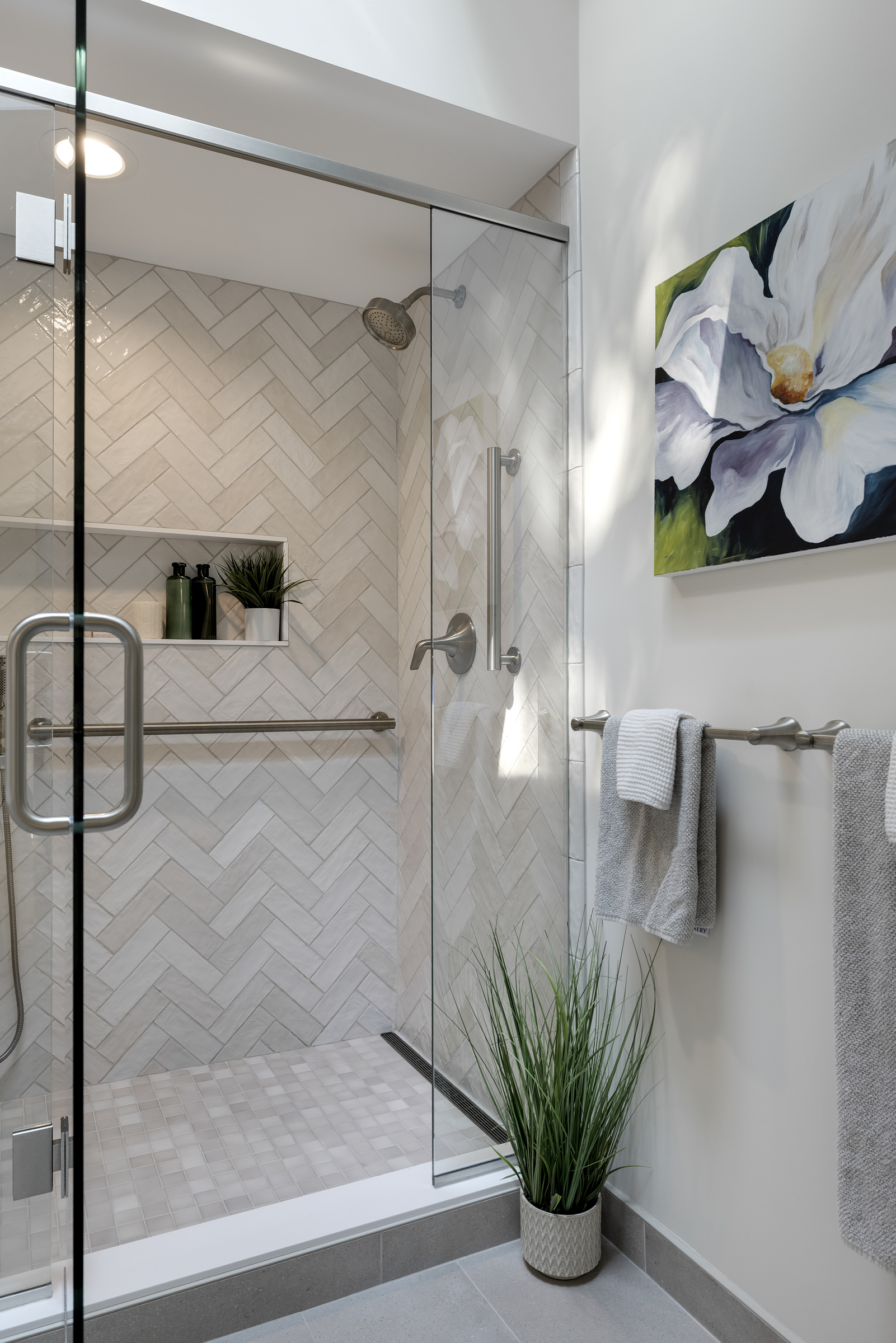 - Grab bars were integrated into the shower design to support accessibility and safety, without compromising the overall look of the space.