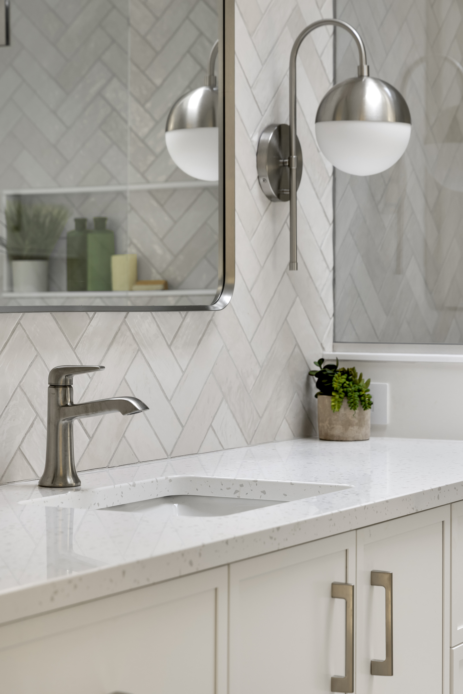 - Cambria quartz countertops were selected for the vanity for their durability and low maintenance.
